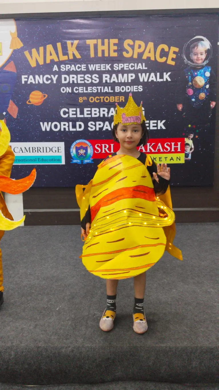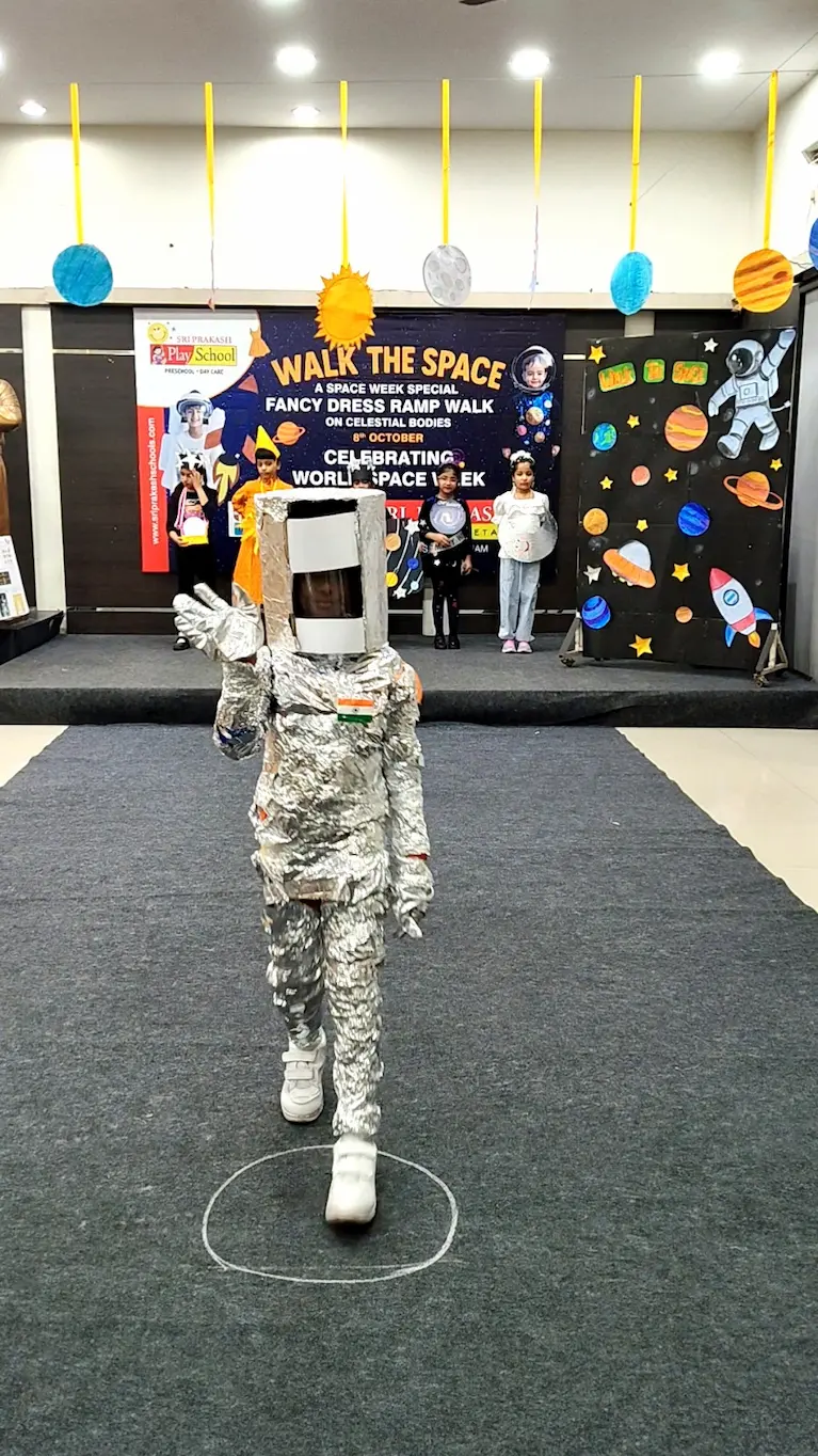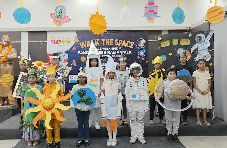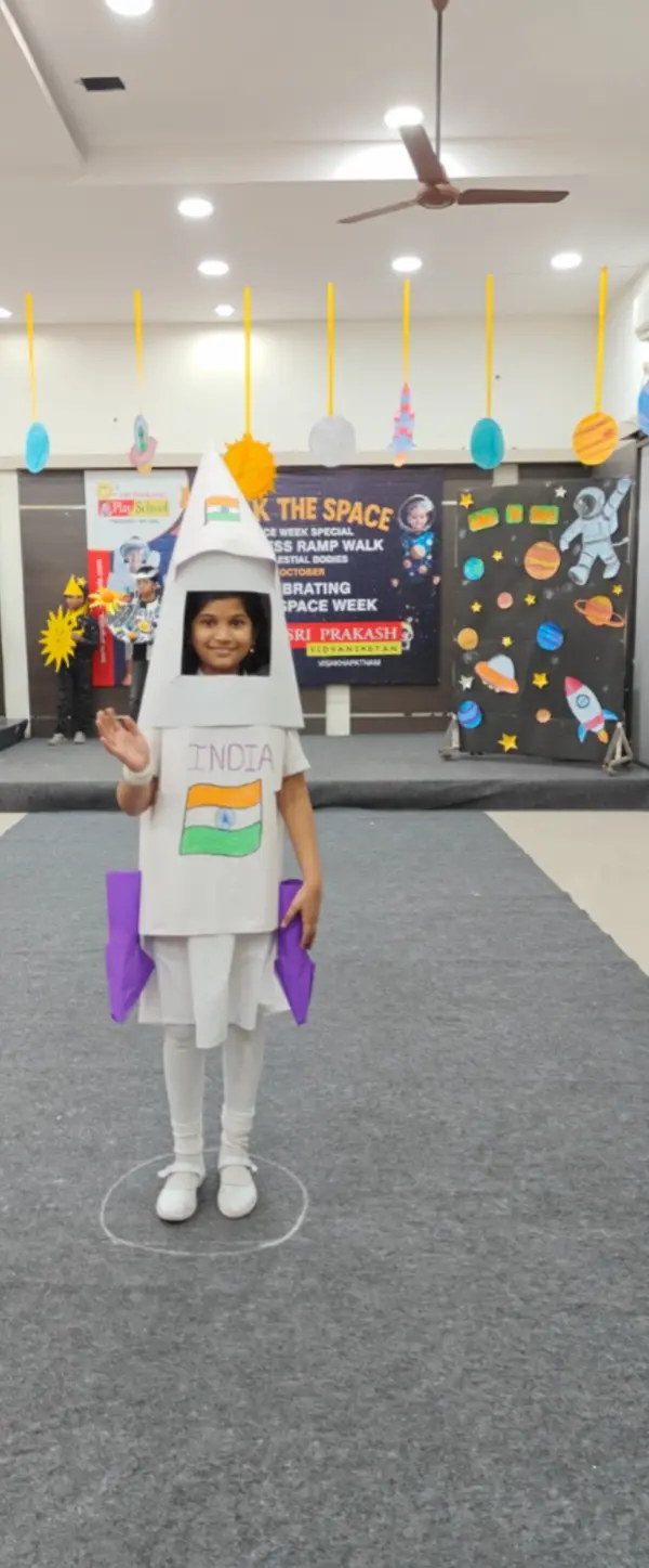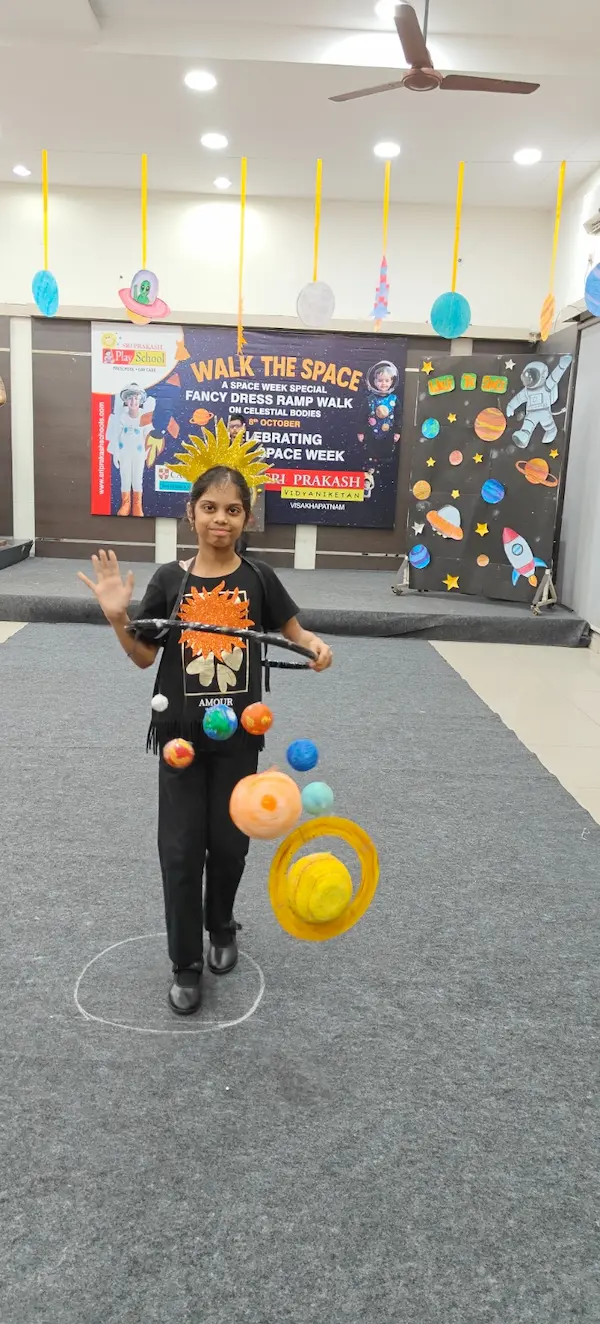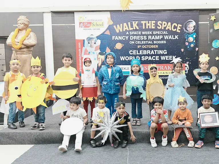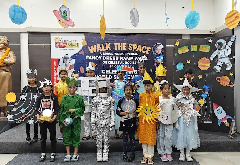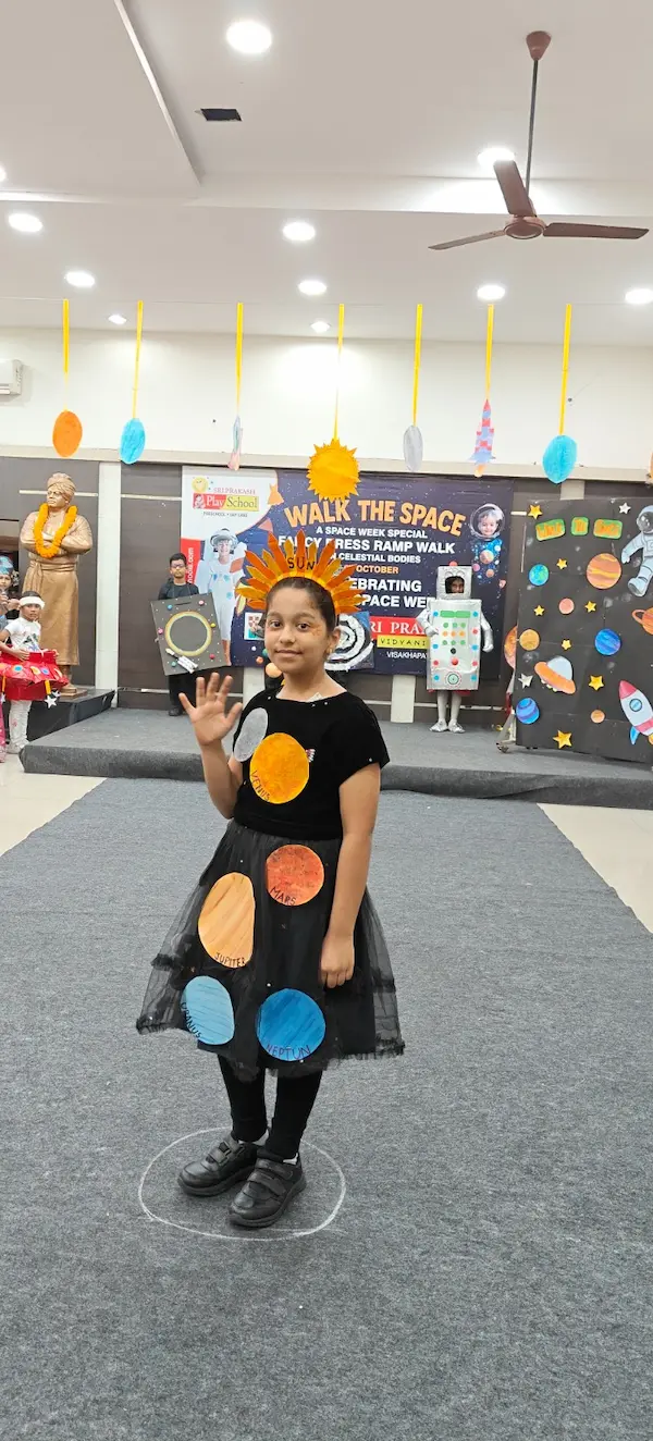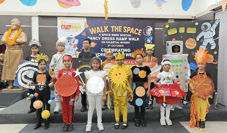 On 8th October 2025, Sriprakash Vidya Niketan, TPT Colony, celebrated World Space Week with a dazzling event titled “Walk the Space – A Fancy Dress Ramp Walk on Celestial Bodies.” The young learners stepped onto the stage dressed as planets, stars, astronauts, rockets, and satellites, showcasing their creativity and enthusiasm for space exploration. Each participant confidently shared interesting facts about their chosen celestial body, filling the atmosphere with excitement and curiosity. The event beautifully combined learning and fun, inspiring students to look beyond the skies and dream of discovering the mysteries of the universe.