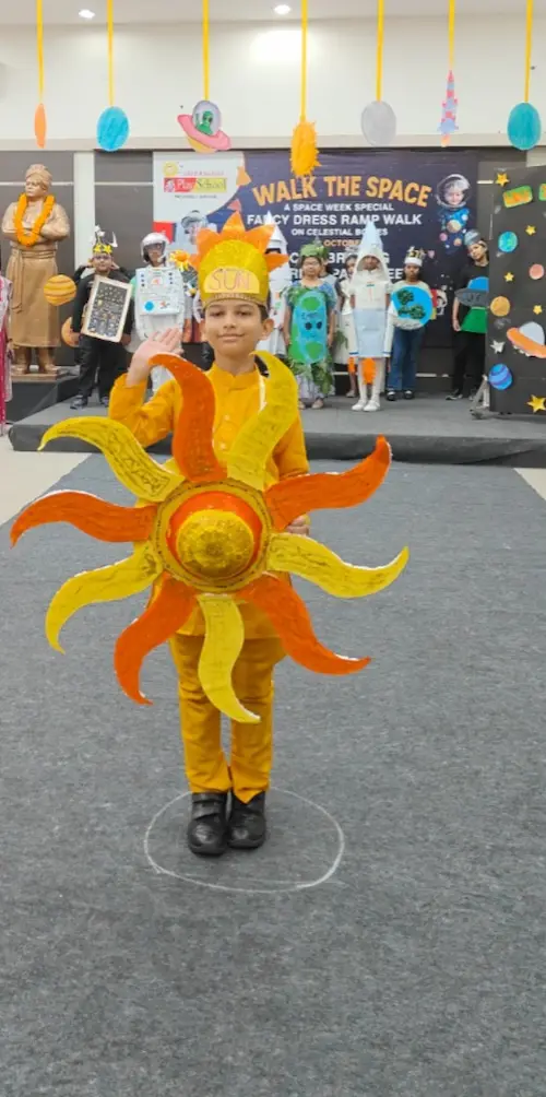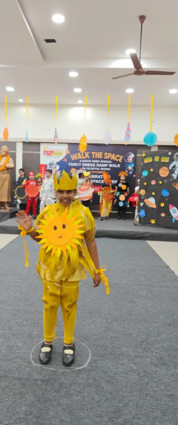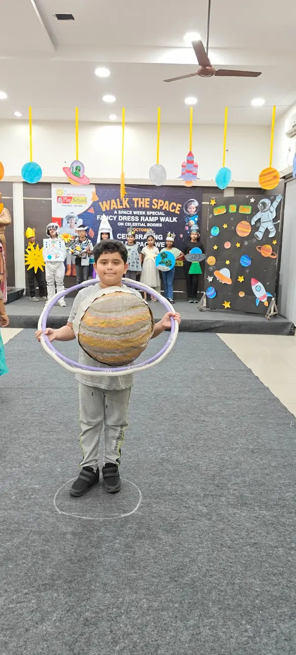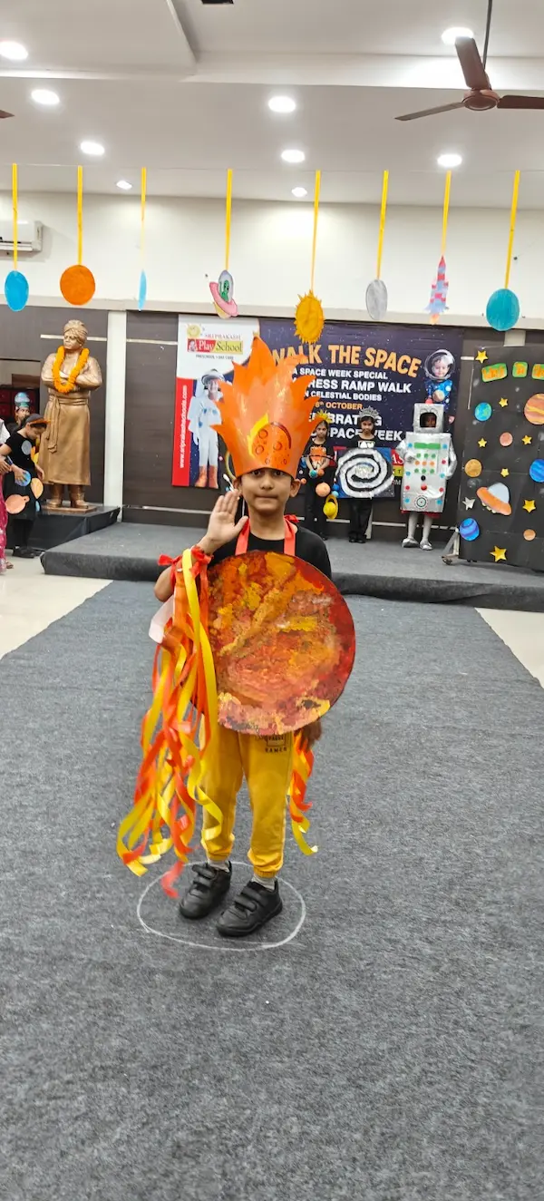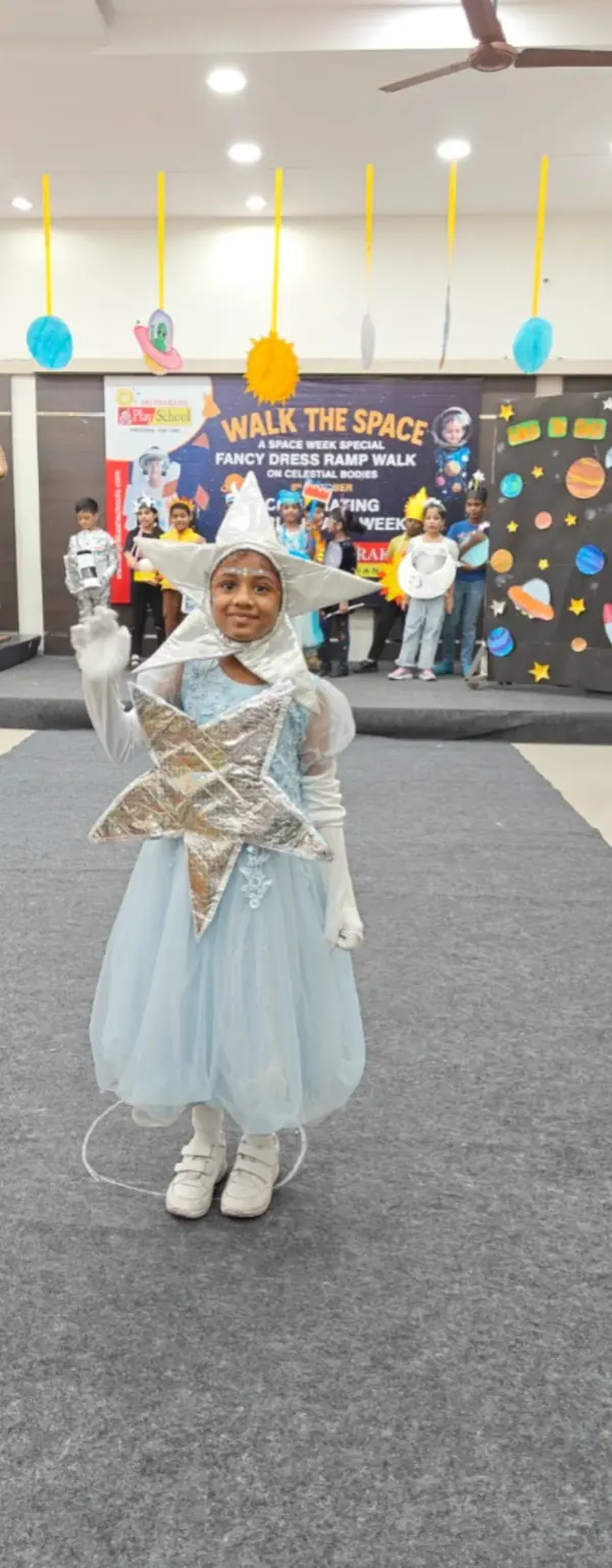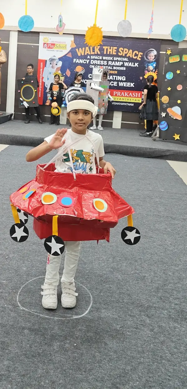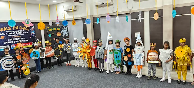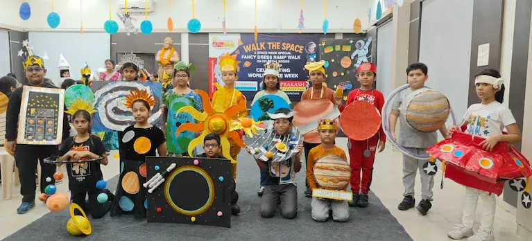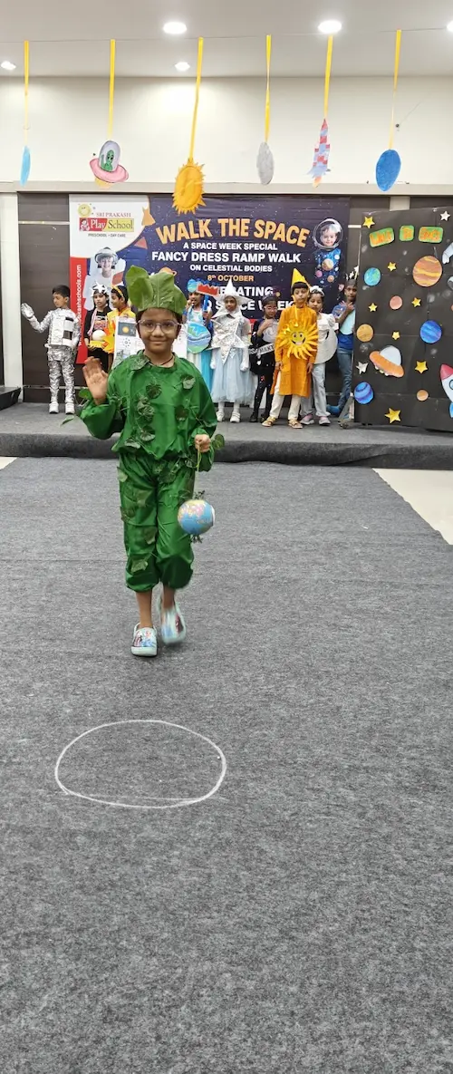 On 8th October 2025, Sriprakash Vidya Niketan, TPT Colony, celebrated World Space Week with a dazzling event titled “Walk the Space – A Fancy Dress Ramp Walk on Celestial Bodies.” The young learners stepped onto the stage dressed as planets, stars, astronauts, rockets, and satellites, showcasing their creativity and enthusiasm for space exploration. Each participant confidently shared interesting facts about their chosen celestial body, filling the atmosphere with excitement and curiosity. The event beautifully combined learning and fun, inspiring students to look beyond the skies and dream of discovering the mysteries of the universe.